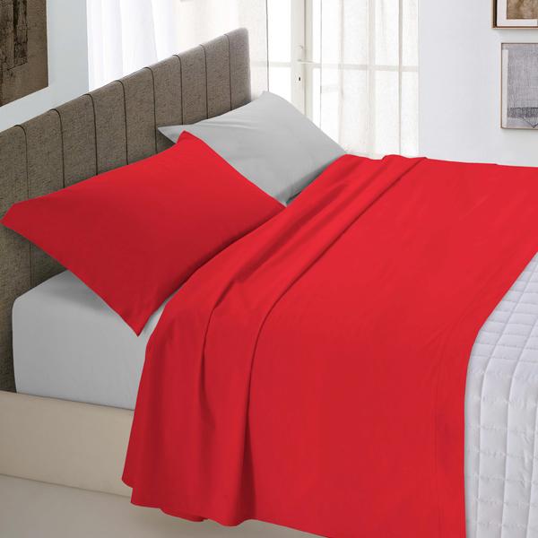 Completo lenzuola tinta unita bicolore. Lenzuolo sopra con bordo cucito a 2 aghi e filo colorato in tinta.