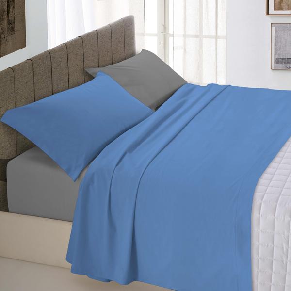 Completo lenzuola tinta unita bicolore. Lenzuolo sopra con bordo cucito a 2 aghi e filo colorato in tinta.