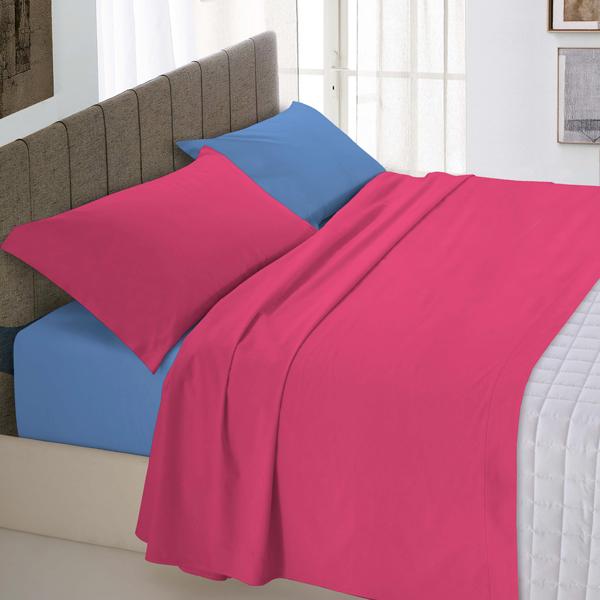 Completo lenzuola tinta unita bicolore. Lenzuolo sopra con bordo cucito a 2 aghi e filo colorato in tinta.