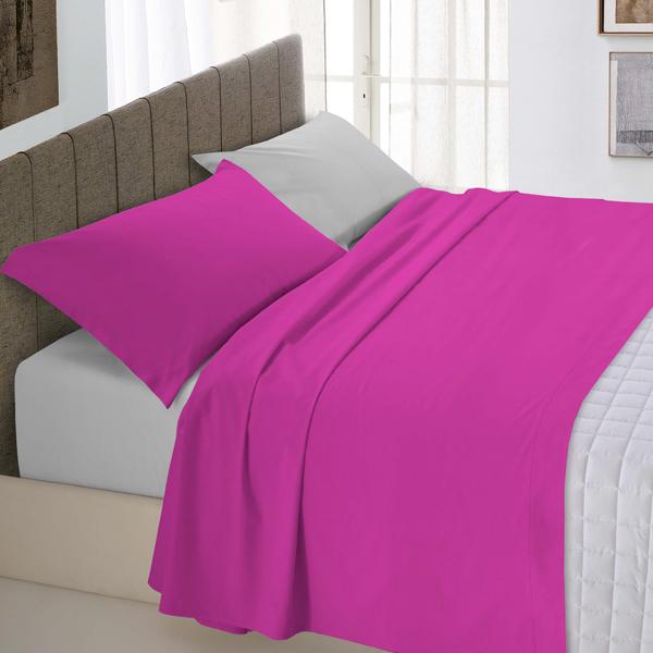 Completo lenzuola tinta unita bicolore. Lenzuolo sopra con bordo cucito a 2 aghi e filo colorato in tinta.