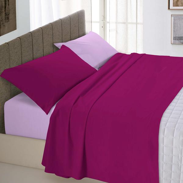 Completo lenzuola tinta unita bicolore. Lenzuolo sopra con bordo cucito a 2 aghi e filo colorato in tinta.