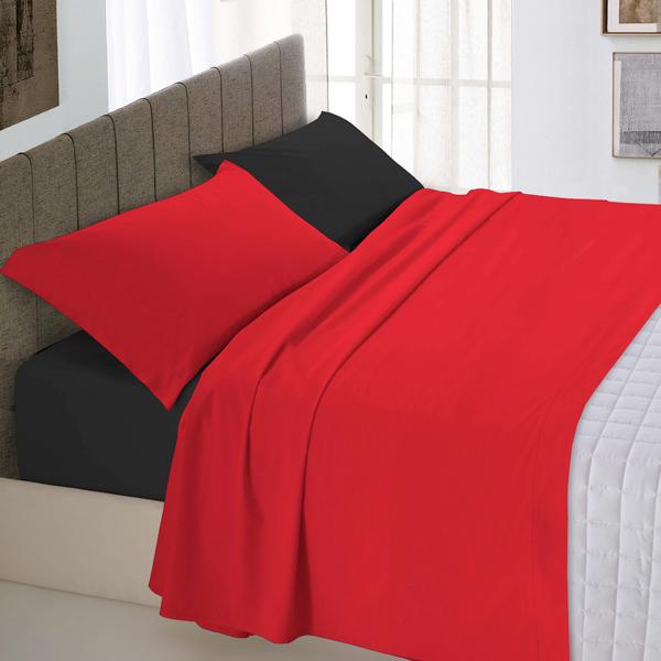 Completo lenzuola tinta unita bicolore. Lenzuolo sopra con bordo cucito a 2 aghi e filo colorato in tinta.