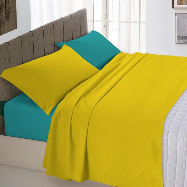 Completo lenzuola tinta unita bicolore. Lenzuolo sopra con bordo cucito a 2 aghi e filo colorato in tinta.
