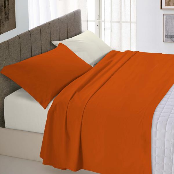 Completo lenzuola tinta unita bicolore. Lenzuolo sopra con bordo cucito a 2 aghi e filo colorato in tinta.