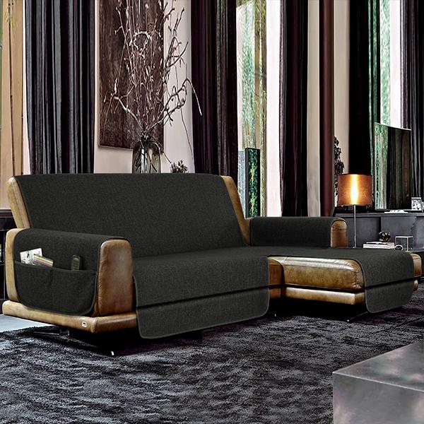 Copri divano, salva divano antiscivolo con penisola a DESTRA VISTA FRONTALMENTE. Tessuto 100% polyestere melange con trattamento antiscivolo sul retro (pvc + silicone stampato). Con due comode tasche portaoggetti sui braccioli.