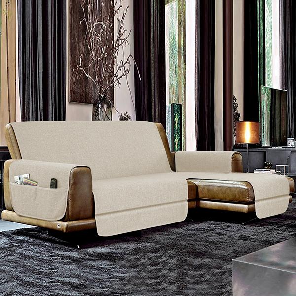 Copri divano, salva divano antiscivolo con penisola a DESTRA VISTA FRONTALMENTE. Tessuto 100% polyestere melange con trattamento antiscivolo sul retro (pvc + silicone stampato). Con due comode tasche portaoggetti sui braccioli.