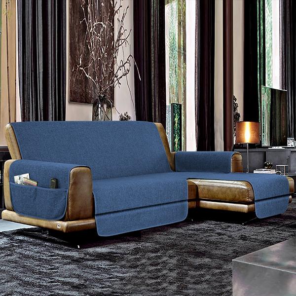 Copri divano, salva divano antiscivolo con penisola a DESTRA VISTA FRONTALMENTE. Tessuto 100% polyestere melange con trattamento antiscivolo sul retro (pvc + silicone stampato). Con due comode tasche portaoggetti sui braccioli.
